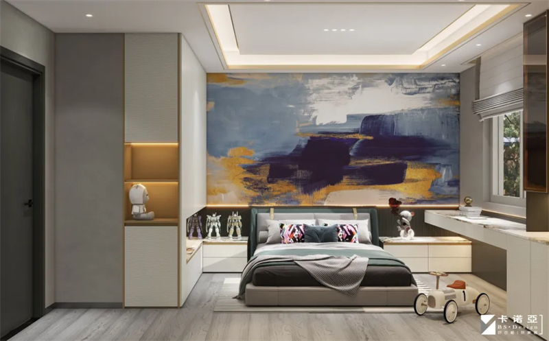 懸浮頂+燈帶吊頂設計,除了輔助照明外,還能讓空間凸顯溫馨氛圍和層次美。床頭柜與衣柜及書桌一體化設計,不占地兒更整體。