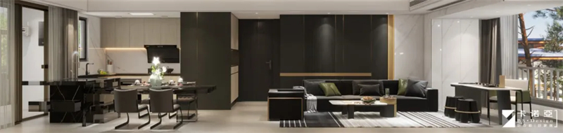 ③廚房采用高級黑+白撞色設計,溫馨木色減緩空間冷感