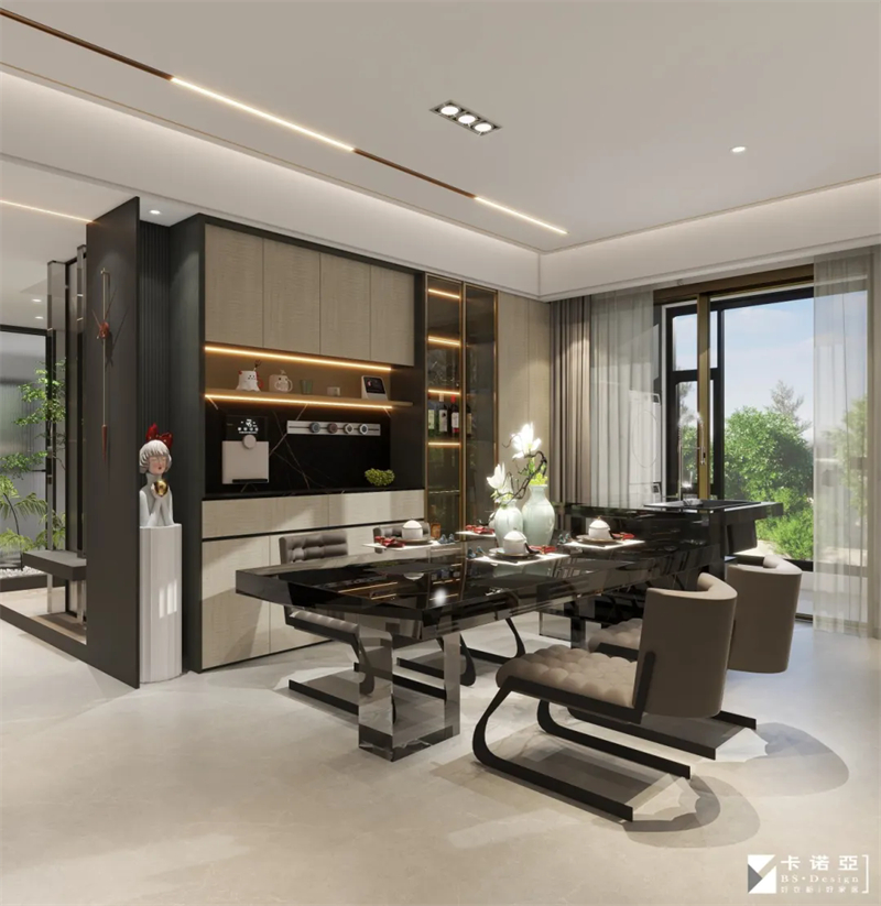 靠近餐桌的地方設置了餐酒柜,色彩與全屋呼應,茶色玻璃柜門通透可見,可以收藏香檳與紅酒、杯具,觥籌交錯,微醺生活,是E人聚會轟趴的好地方。
