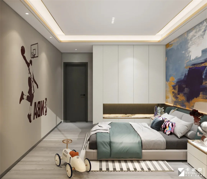 沿墻邊進行空間布局,打造學習區(qū)、休閑區(qū)和收納區(qū),讓男孩擁有自己的私享天地。