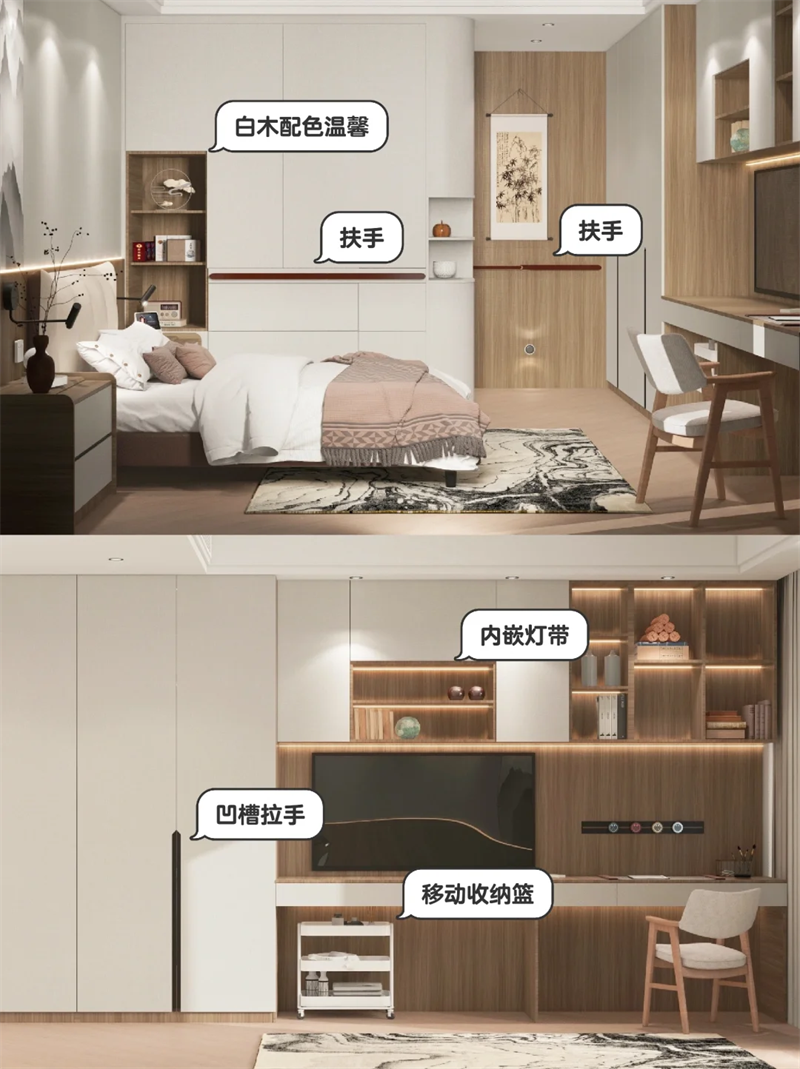 ??在衣柜門和進門墻面增加了扶手設計,老人行動有支撐更加安全便捷。