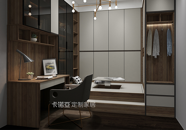 臥室比較沉穩大氣,玻璃門半開放式衣柜黑白相間,空間空曠開放,有點極簡風。
