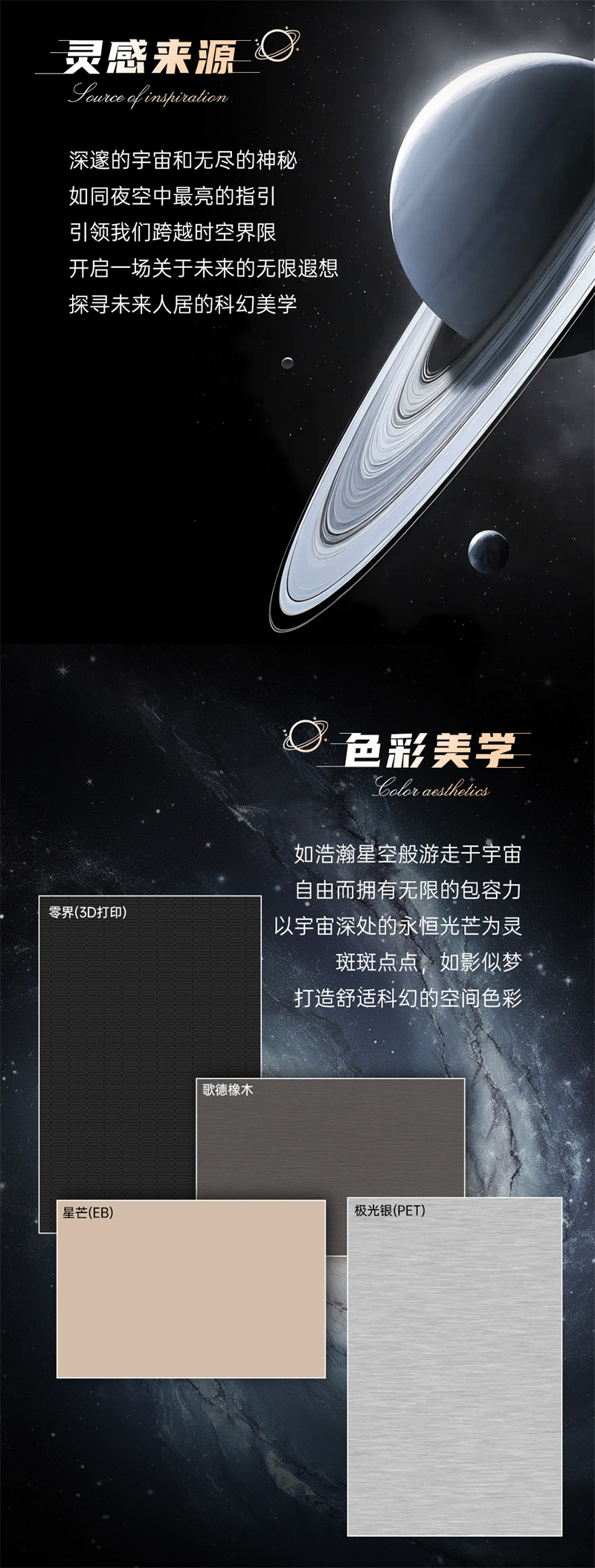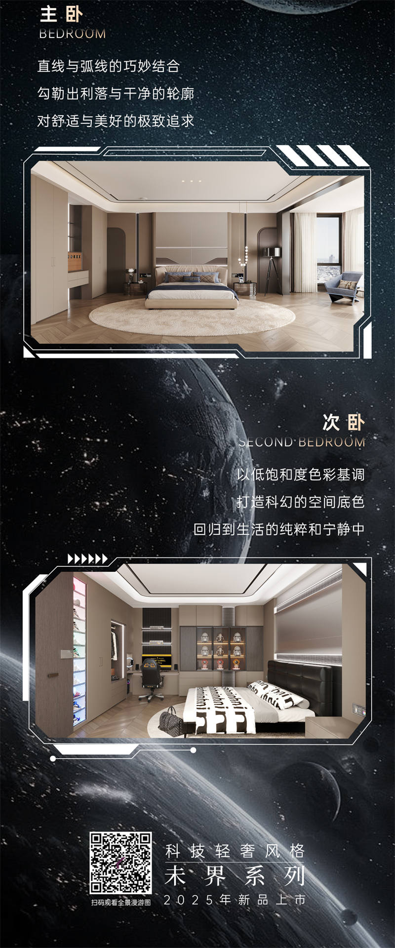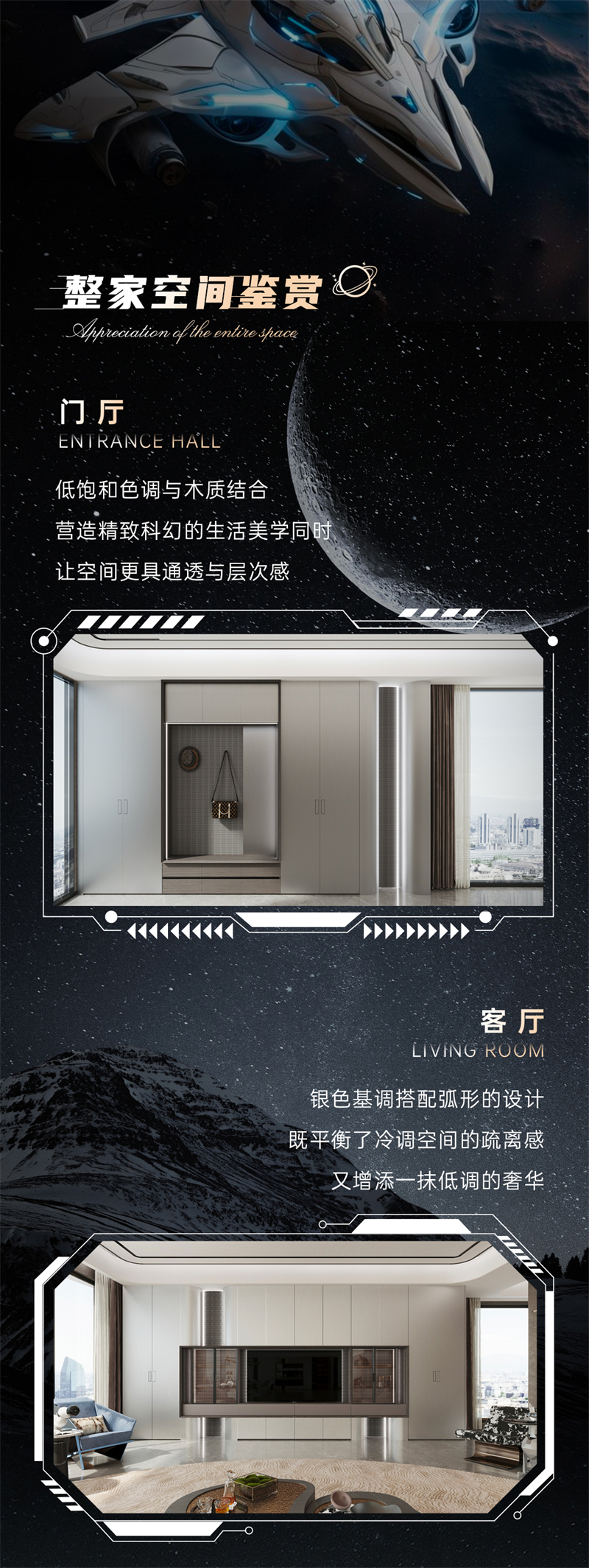 以科技青年(航天設計師、汽車工程師、科技創(chuàng)業(yè)者等)職業(yè)特性為核心,融入航天元素與汽車模型展示,借助流暢線條、科技燈光,搭配智能家居,營造未來感氛圍,滿足對科幻的遐想,實現(xiàn)科技與生活的融合,展現(xiàn)探索精神。