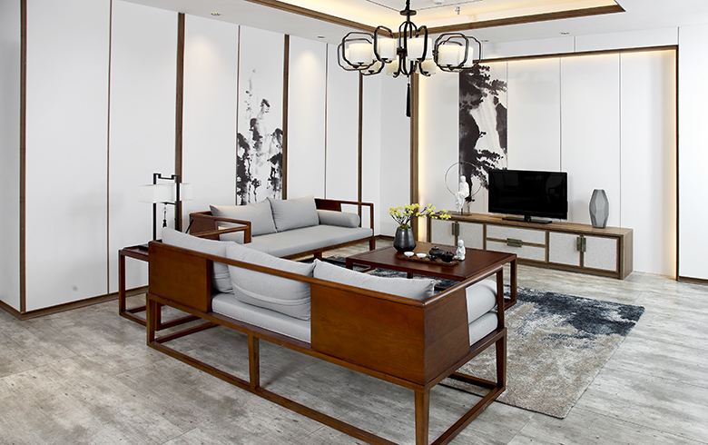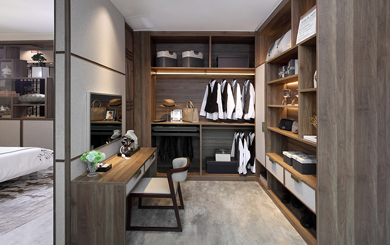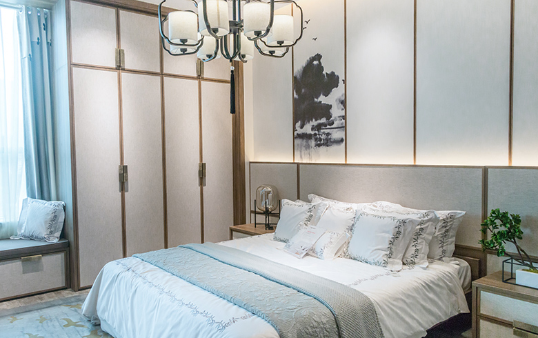 整面墻采用到頂的半開放式酒柜,收納功能強大,既可放置名酒,又可擺放飾品,提高家居格調,彰顯主人品位。中式傳統回字形的墻面,與天花板造型遙相呼應。上下儲物柜可放置餐具碗筷,聲動感應燈,可照亮飾品,為空間增色,讓食欲大增。