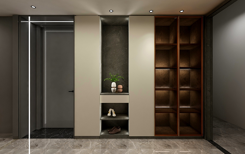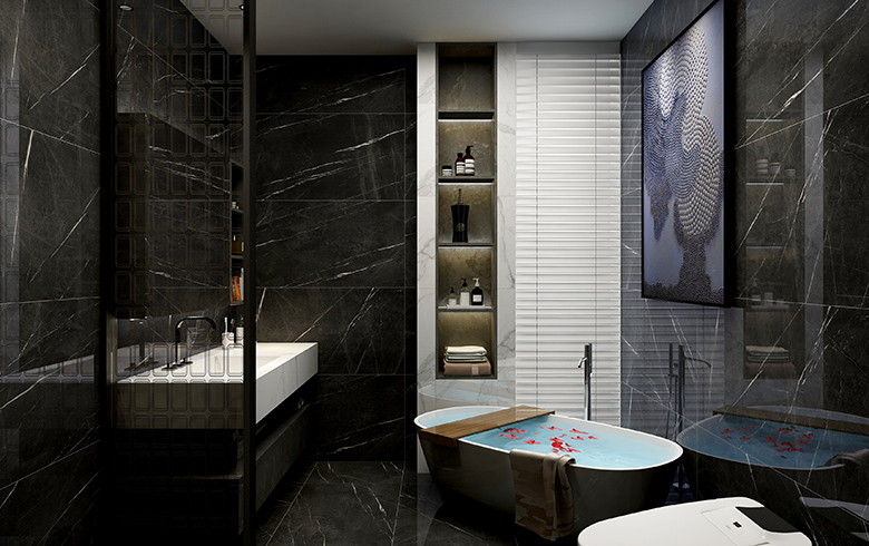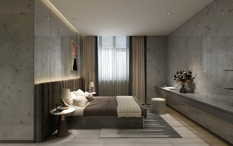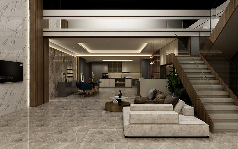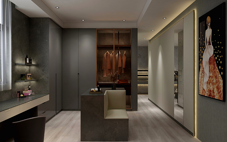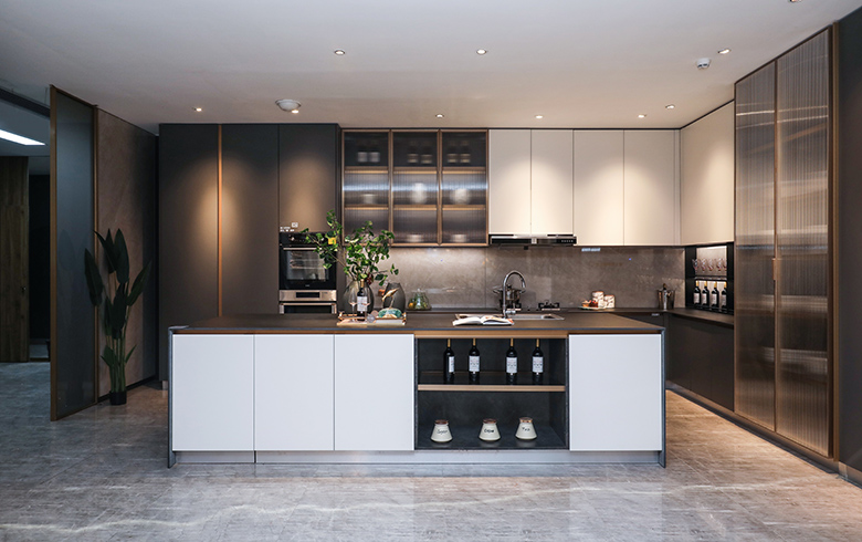 “御品木”溫柔的木紋,碰撞3D大理石硬朗的石紋,極簡“銀河黑”過渡,一起裝飾餐廳背景墻,修長的餐桌椅腿腳、墻面金屬掛板等輕奢元素點綴,打造尊榮的就餐儀式感。