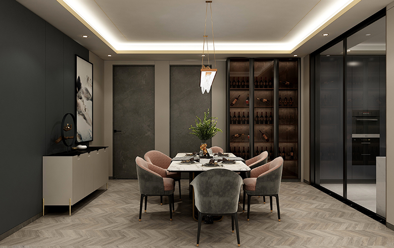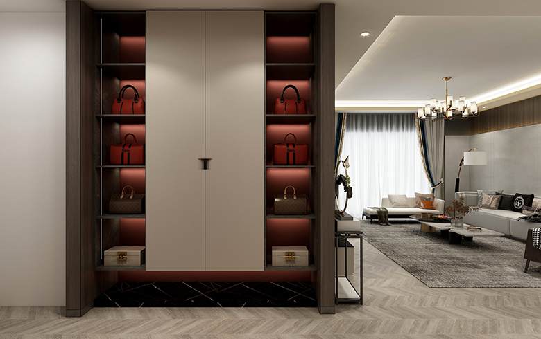 走廊過道區域,千萬別空著,花點心思去設計裝修,便能四兩拔千斤。高顏值的鞋柜與玄關分布在過道兩邊,擺脫傳統過道兩堵白墻的單一沉悶,讓狹長的過道成為一道靚麗的風景線。
