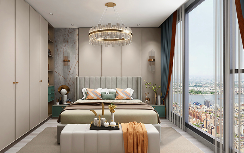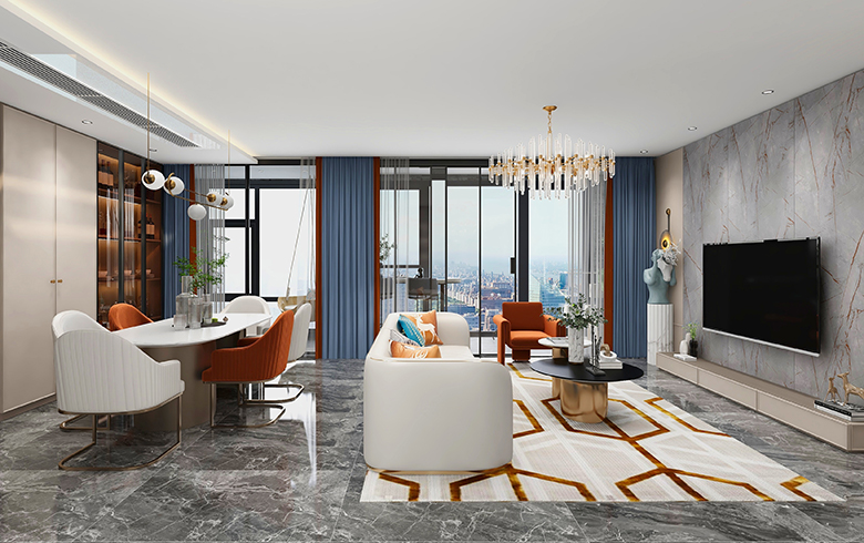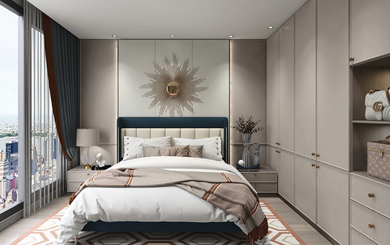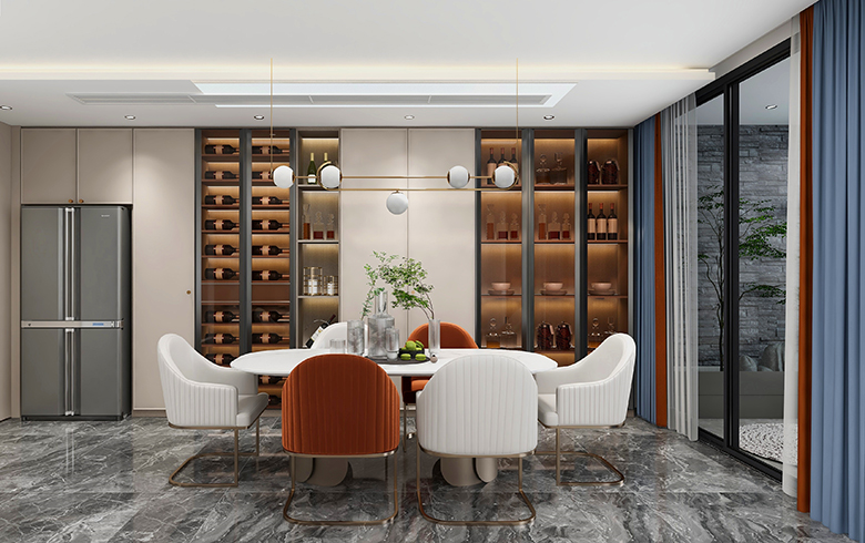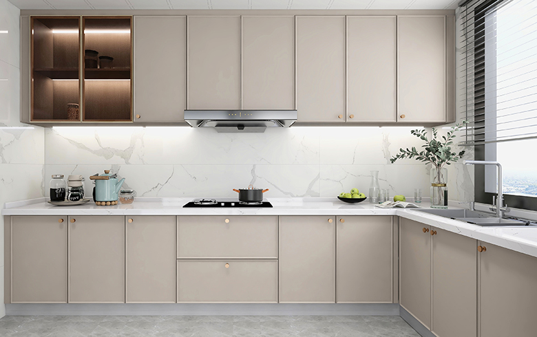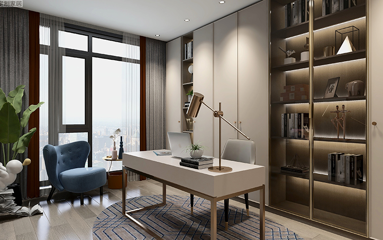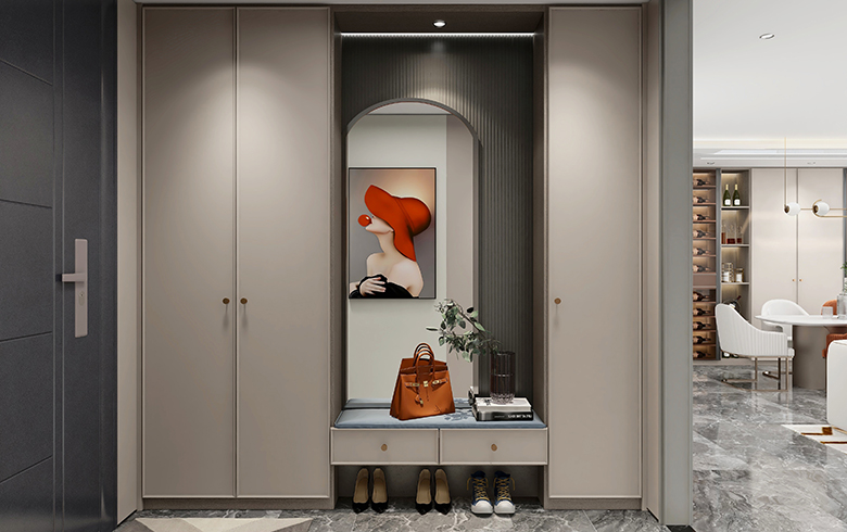 過(guò)道盡頭設(shè)計(jì)一排吊柜,“優(yōu)雅暖灰”柜門混搭“流光漫步”柜體, “黑金剛”地臺(tái)搭配“慕尼黑”格柵板,酷尚而精致。