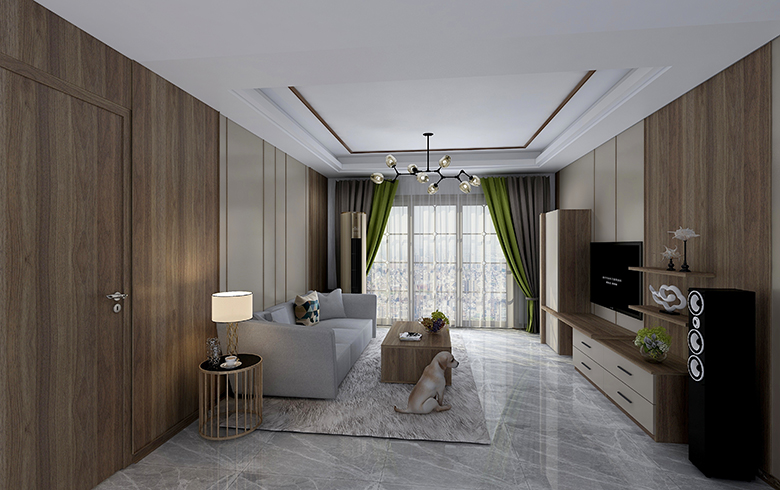 客廳護墻系統采用原木色與灰色的撞色設計,大小不一、顏色不同的板材拼接帶來的錯落感,專利扣線與御品木自帶的線條相呼應,豐富了色彩層次感,營造時尚、高挑的都市現代簡約客廳。