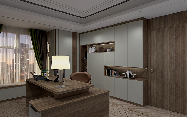 護墻系統采用御品木+紳士灰的創意混搭,配合柔和燈光,營造靜謐舒適的書房環境,專利扣線與板材花色保持統一無色差,且很好地包梁包柱,極大地增添了整體空間的統一感。