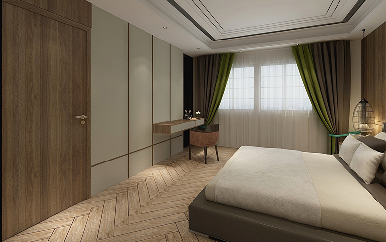 御品木+紳士灰的色系組合裝飾墻面,原木色淡化灰色的冷感和單一,整體溫馨舒適,仿佛睡在大自然、森呼吸。