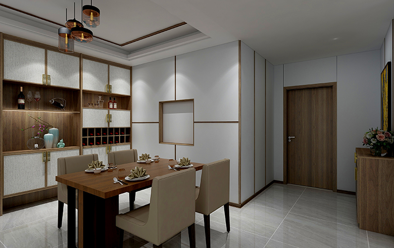 餐廳護(hù)墻系統(tǒng)巧妙運(yùn)用專(zhuān)利扣線(xiàn),將墻面護(hù)墻板無(wú)縫銜接,構(gòu)筑中式特有的回字形造型,整體簡(jiǎn)潔美觀、雍容大方。