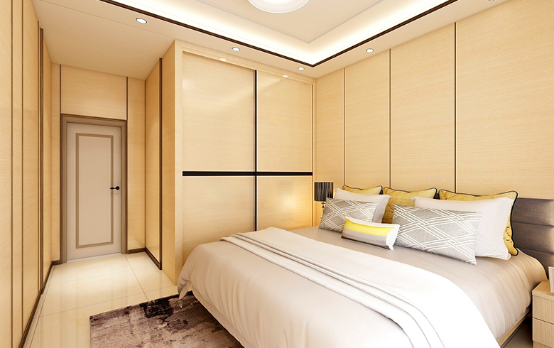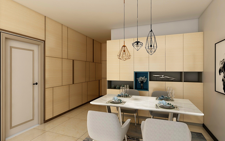 開放式的餐廳,整體視覺寬廣開闊。空間中使用大面積的楠木原木色護墻系統,大小不一富于變化,深色原木線條點綴,深淺木色撞色設計,讓視覺百變靈動,在凸顯主人個性的同時,又營造了溫馨清新的用餐氛圍。