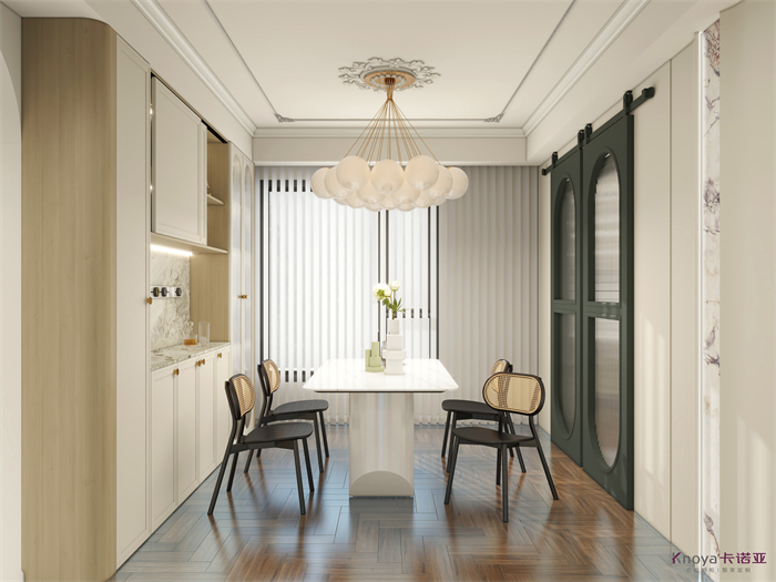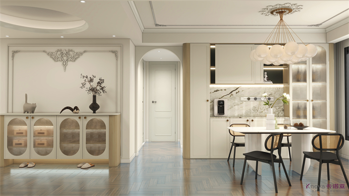 此方案是一套三室一書房加客餐廳的結(jié)構(gòu),根據(jù)客戶要求整體采用輕法式的風(fēng)格,同時多個空間聯(lián)動,拉近家人之間的關(guān)系。為了區(qū)分生活和工作,采納了用緊靠客廳一個臥室空間改造成書房獨立出來不會影響整體的休息區(qū)。生活不只有工作!