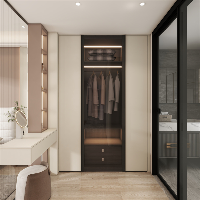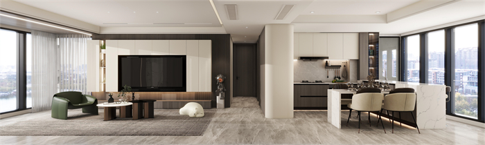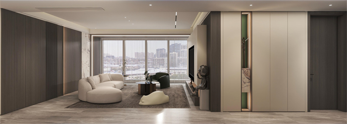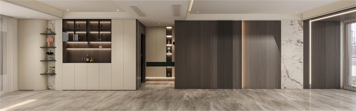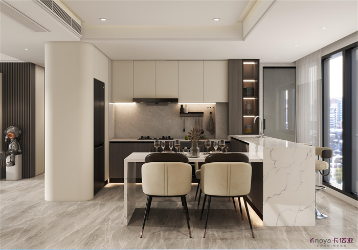 這是一個三口之家,客戶是都市精英人才,對生活充滿了熱愛,對品質有著極高的要求,所以本方案主要以高級灰木紋色為主,搭配溫柔典雅的水性漆雅杏,給客戶營造一個親近自然,同時又不失奢華的溫馨舒適的空間。廚房在原有的空間上做了一個大膽的改造,打造了一個中西結合的開放式廚房,空間更大,功能更齊全。同時一些墻角和柜體也做了圓弧設計,動線更加流暢的同時,更顯時尚和高級。