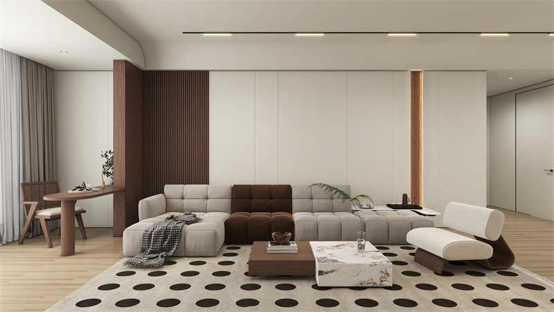 沙發背景墻采用深淺撞色設計,與電視柜、沙發在色彩上相呼應。隔斷墻延伸的書桌,既可作為隔斷,又能辦公學習。