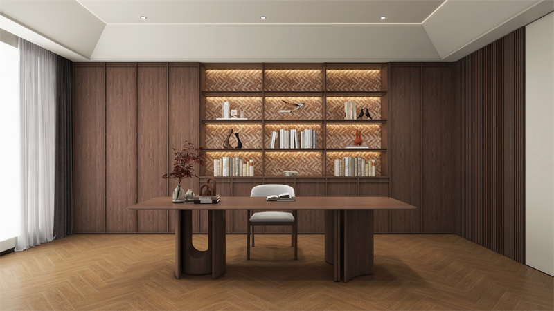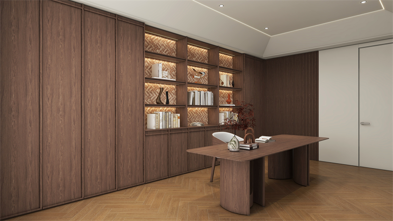 整墻書柜巧妙地運用了骨骼門,凹凸有致的骨骼線,將線條元素與柜體柜門完美融合,增強視覺沖擊力。結合胡桃木的色彩紋理,營造復古的空間氛圍,勾勒中古風獨有的精致造型,彰顯別樣的藝術氣息。