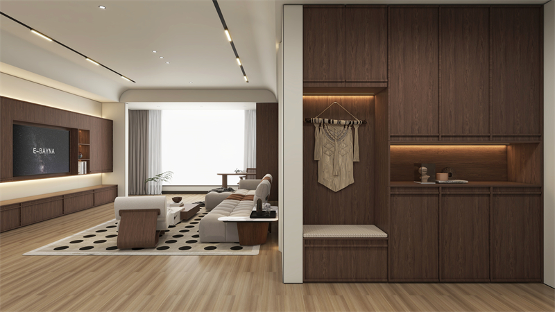 清秋胡桃與骨骼線搭配設計,從入戶起就開始鋪墊復古的基調。中間鏤空、換鞋凳的設計,讓鞋柜實用性與裝飾性兼備,開放區集掛、坐、置三重功能于一體。