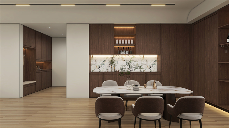 韶光系列汲取金秋的詩意靈感,煦色韶光,鎏金年華,于都市喧器中,借自然手法,將復古細膩的“清秋胡桃”棕色木皮紋理融于空間,營造高雅格調的詩意棲居空間。溫暖而深沉的棕色,細膩的紋理,自然的質感,不禁讓人聯想到秋天的寧靜,打造溫暖懷舊且質樸高雅的氛圍。