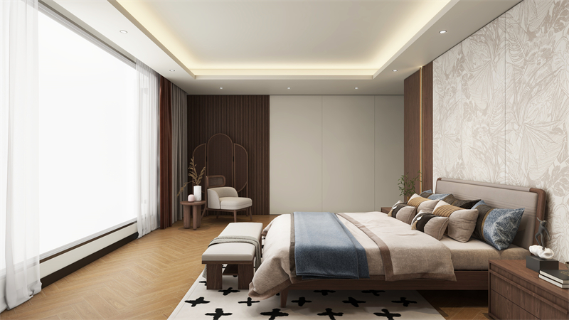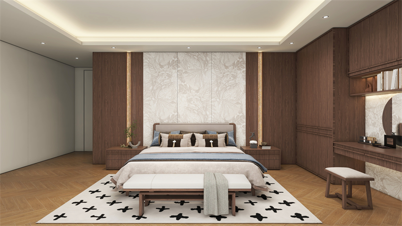 床頭背景墻清秋胡桃護墻板與藤編元素彼此呼應,立體質感的格柵板加持,將中古風的復古與雅致演繹得恰如其分。