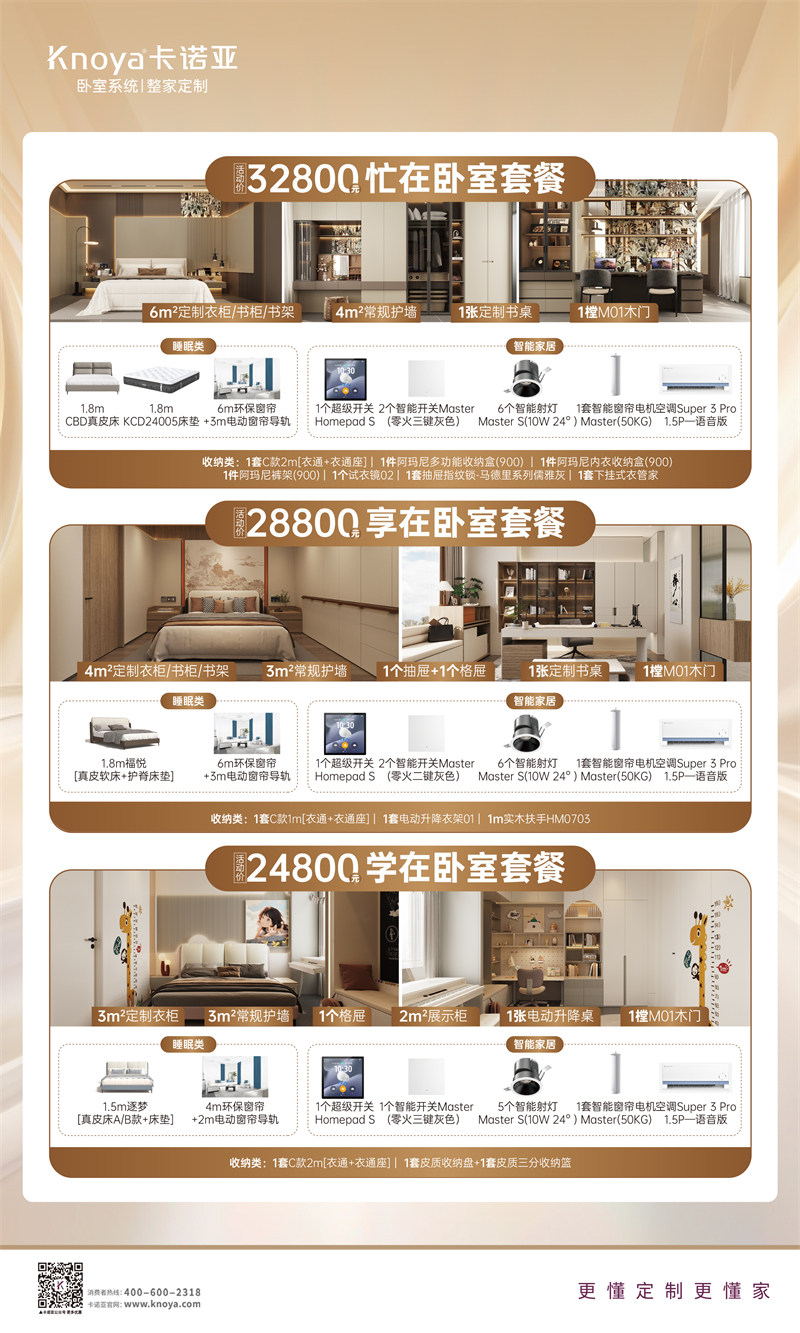 本次活動,卡諾亞還特別推出32800元忙在臥室套餐、28800元享在臥室套餐、24800元學在臥室套餐等,涵蓋臥室系統+整家定制2大品類,包含定制柜、護墻板、全屋家具及智能家電,同時攜手芝華仕、CBD、云米科技等多個高端品牌,致力于為消費者打造舒適、便捷且極具品質感的理想臥室空間。