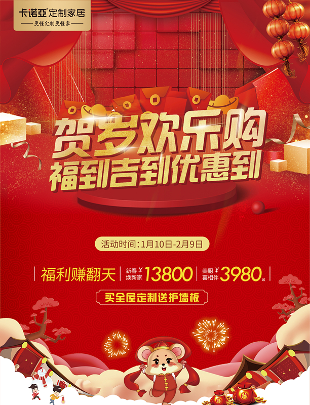 離農歷新年越來越近,卡諾亞本著精工匠心,點亮了春節不打烊的PLUS福利,1月10日-2月9日期間為業主朋友們準備了“賀歲歡樂購·福到吉到優惠到”的新年開運大禮,包括全屋定制僅售¥13800/套再送護墻板、廚房¥3980/套起、付定金增值¥50/天等,誠意為消費者送來最后一波福利,2020年繼續延伸“安醛居家,健康無價”的新生活,綻放“空間定制”的家居整體解決方案之美。