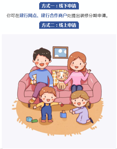 你在線上、線下亦可申請報名裝修分期,并向建行工作人員提交身份證、房產證明等相關資料。