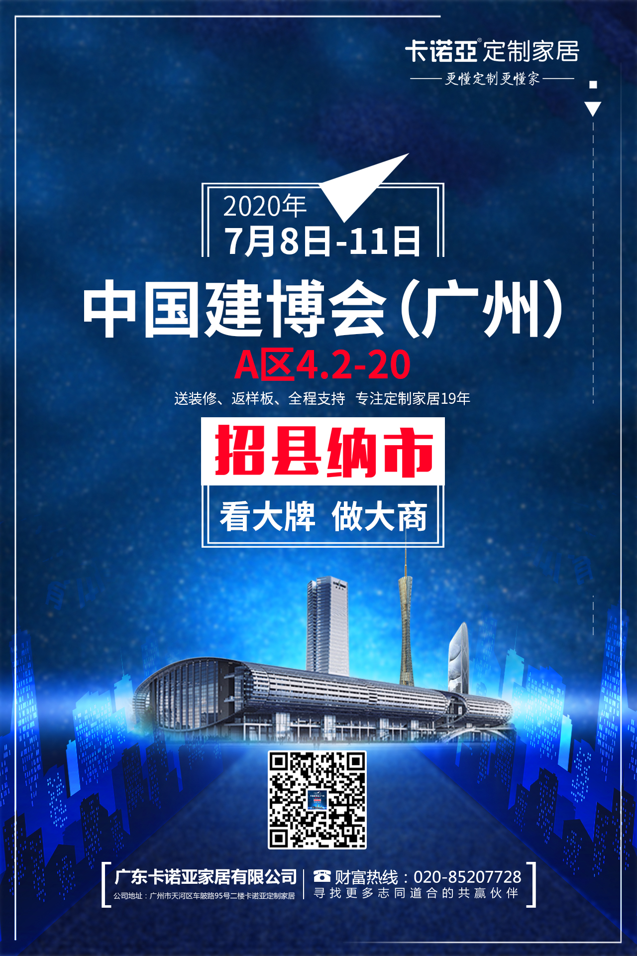 2020年是不平凡的一年,面對嚴峻的疫情,中國建博會(廣州)排除萬難,為行業謀疫后發展。作為行業疫后市場復蘇的晴雨表,7月8日中國建博會(廣州)將如期開幕,這是行業疫后第一展,作為大家居建裝行業全球規模最大的展覽會,“中國全屋定制十大品牌”卡諾亞積極籌劃參展,將攜現代簡約與新中式混搭MIX&MATCH力作驚艷登陸展會。此外,眾多創業者非常關注卡諾亞的政策變化,屆時將在會場揭曉,萬眾矚目,敬請期待。