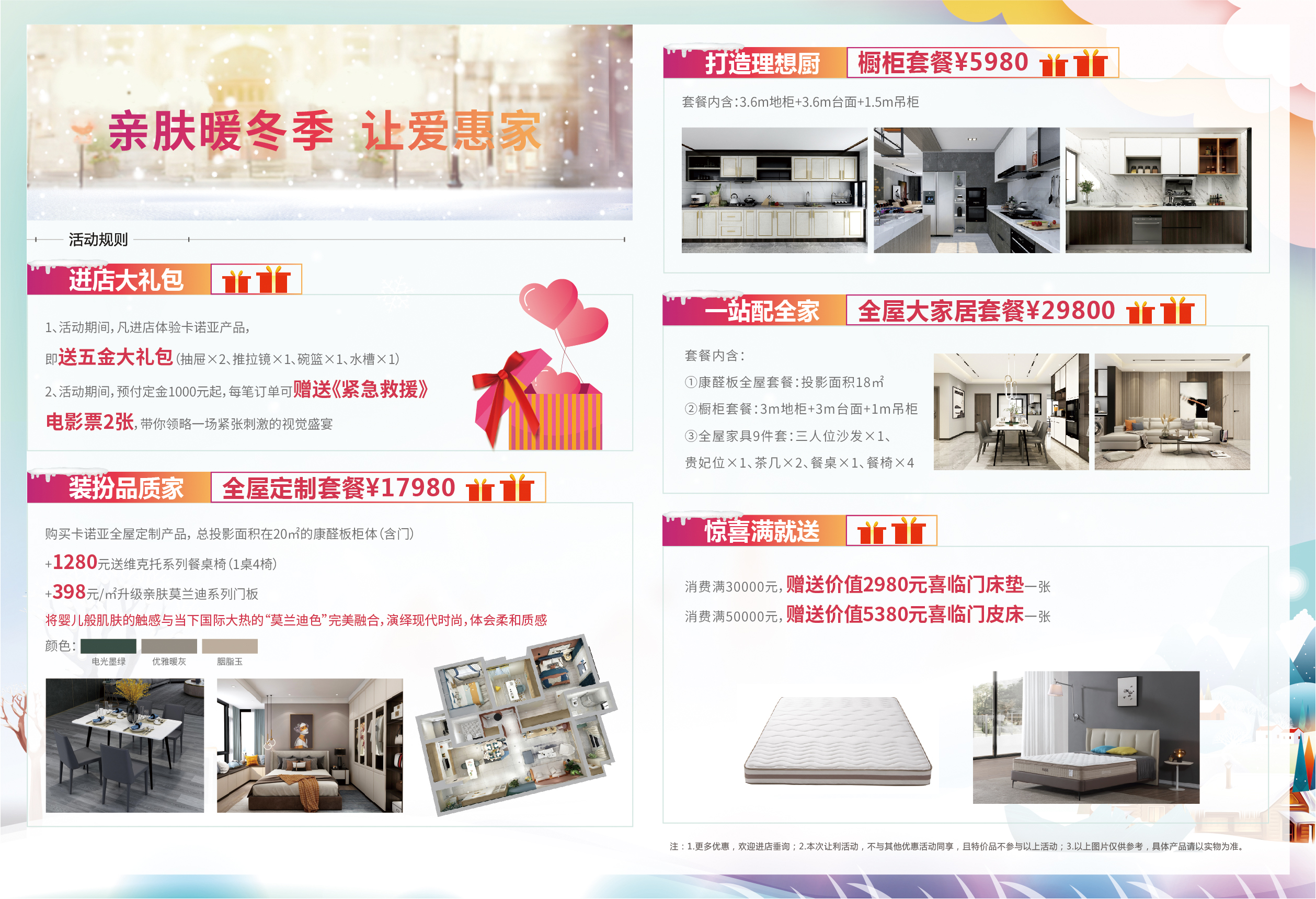 年終福利|卡諾亞定制家居辭舊迎新家“讓愛惠家” 年終歲末,正值辭舊迎新之際,歡樂的節(jié)日氛圍給寒冬增添了濃濃暖意。2020年12月18日-2021年1月3日,“中國定制家居十大品牌”卡諾亞誠意推出“親膚暖冬季,讓愛惠家”年度最后一波福利活動(dòng),并在卡諾亞全國1000余家專賣店展開,包括全屋定制套餐¥17980、櫥柜套餐¥5980、全屋大家居套餐¥29800等暖心鉅惠,新年煥新家,健康品質(zhì)家居輕松擁有。