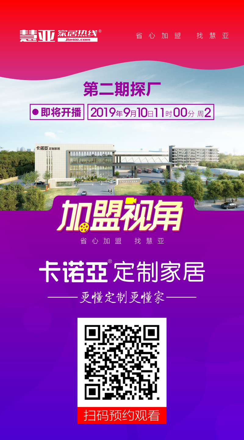重磅信息!!!9月10日慧亞家居熱線《加盟視角》將會(huì)正式開(kāi)播,走進(jìn)家居行業(yè)知名品牌卡諾亞,專(zhuān)業(yè)定制家居18年,全國(guó)1000+專(zhuān)賣(mài)店,20余萬(wàn)㎡工業(yè)4.0智造基地,每年服務(wù)百萬(wàn)家庭。本期節(jié)目將全方位揭曉卡諾亞是如何讓加盟商放心賺錢(qián)!